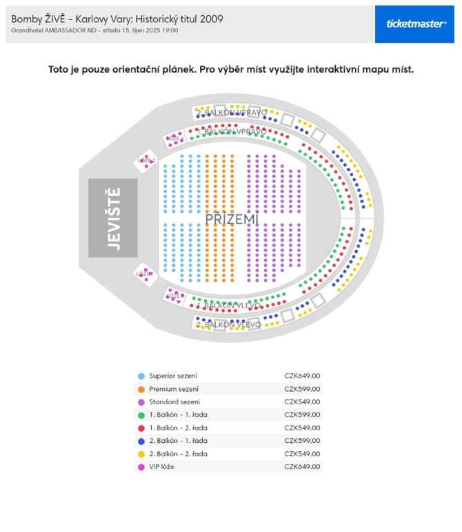 Níže poskytnutá mapa není výstižná vzhledem k aktuální dostupnosti. Schémata sezení zobrazují obecné rozložení místa konání akce v daný okamžik a pro určité události se uspořádání a přesné přidělení sedadel může změnit bez předchozího upozornění.