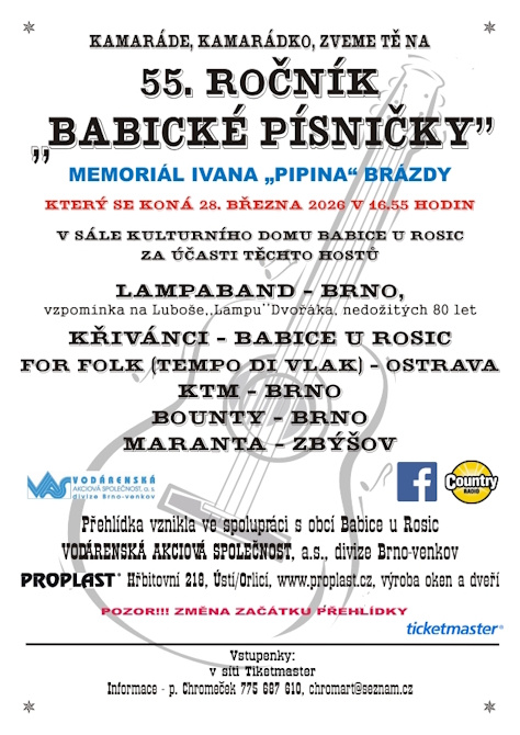 KD Babice u Rosic Náves 14, , Babice u Rosic, Czech RepublicUdálost ,Babické písničky, se bude konat dne 28/03/2026, s počátečním časem 16:55:00 v KD Babice u Rosic